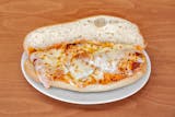 Crispy chicken cutlet with mozzarella and tomato sauce on a toasted sub roll.